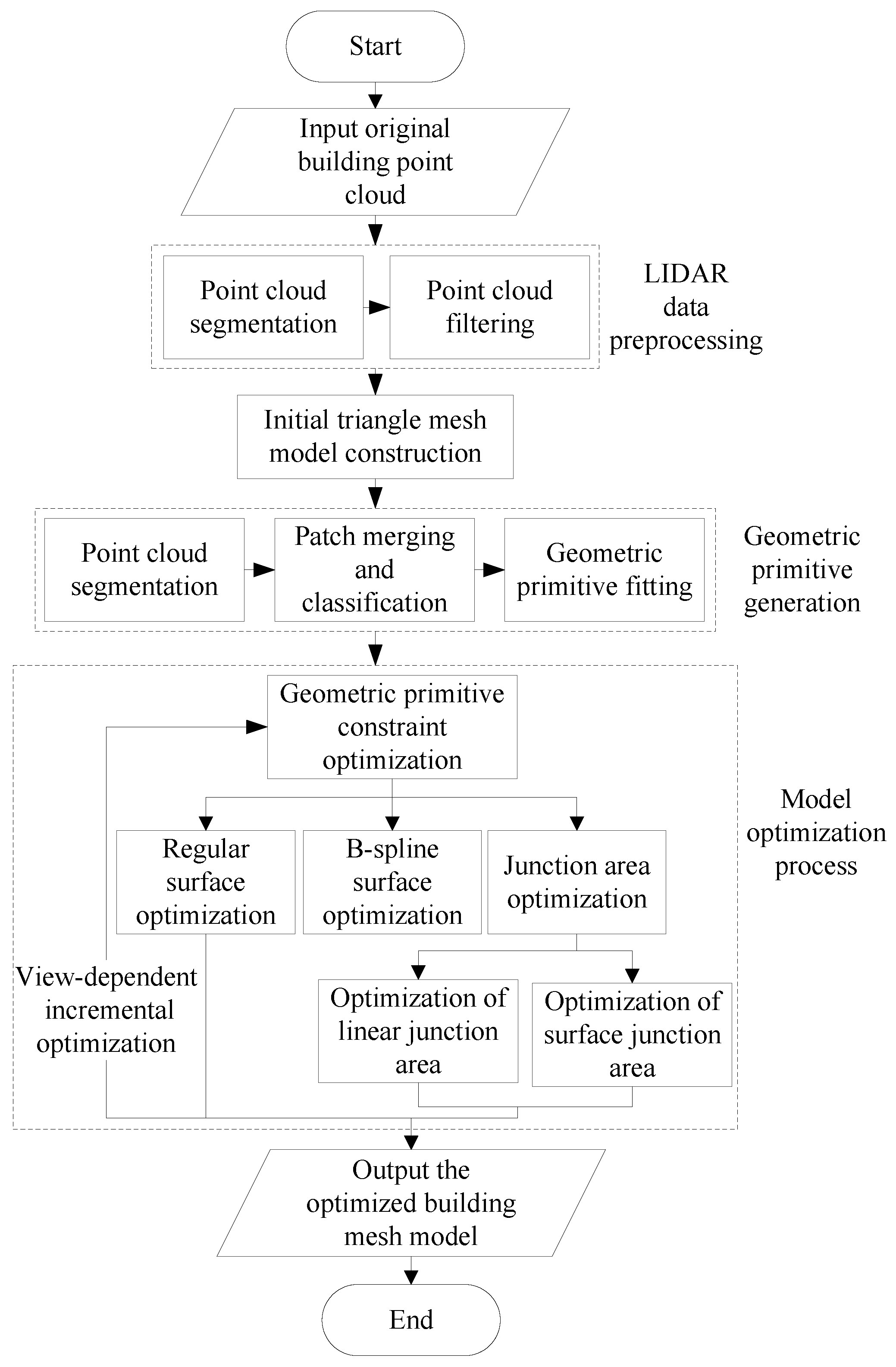 - A reconstruction method for the building LIDAR point cloud based on geometric primitive constrained optimization is proposed, which takes into account both the reconstruction accuracy and the complex and time-consuming modeling process;