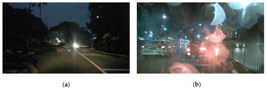 Example of challenges with nighttime images on the NuScenes [5] dataset. (a) Strong headlights completely obscure the opposing vehicle; (b) Rain droplets on the camera create large reflections.