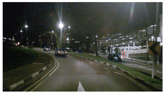 In the second configuration, the training dataset was expanded to include original nighttime images while reducing the proportion of daytime samples. This adjustment was made to improve the balance between day and night data and to mitigate overfitting toward daytime scenes. The corresponding results are reported in Table 3 for the car class and Table 4 for the pedestrian class. Since certain datasets required longer training durations to achieve convergence, the number of training epochs is also indicated in each table. In addition, Figure 4 provides a qualitative example of detections obtained from a model trained under this second configuration using style-transferred nighttime images.