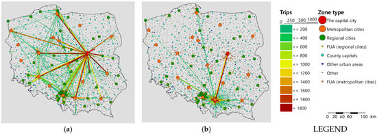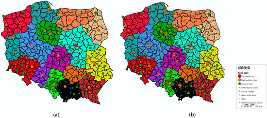 The gravity model used in this study is based on the Zintegrowany Model Ruchu (ZMR), the National Transport Model of Poland [19]. The model is based on the classical four-step methodology. In terms of the trip generation and distribution stages, it incorporates a deterrence function and trip rates defined for 13 types of municipalities (the capital city, regional capitals, county towns, and urban, rural, and mixed municipalities further differentiated by their inclusion in functional urban areas) illustrated in Figure 1a (major cities across Poland) and in Figure 1b (all municipalities).