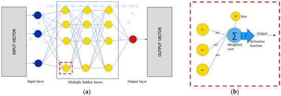 Deep Neural Networks (DNNs) are an extension of classical Artificial Neural Networks (ANNs), characterized by architectures composed of multiple hidden layers positioned between the input and output layers, as shown in Figure 2a. Each layer consists of a set of neurons that process input data using activation functions and pass the resulting signals to the next layer.