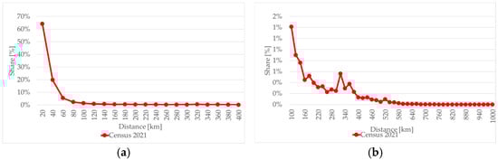 As shown in Figure 4, the majority of journeys, constituting 93%, are confined to a distance of 100 km. An increase in the share of journeys in the 300–400 km range can be observed, which is due to the settlement pattern of Poland illustrated in Figure 5, where the main urban centers corresponding to the provincial capitals mostly fall within this distance, particularly in relation to the capital.