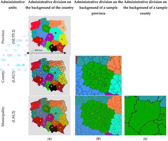 Administrative divisions of the whole country (a), a voivodship (b) and a district (c).