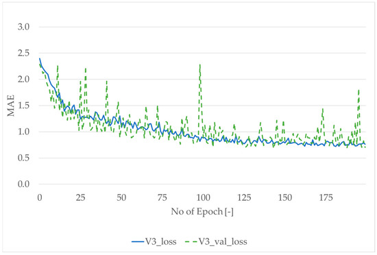 The trained DNNs were used to generate complete PA matrices based on the full set of input data. Each model produced 6,135,529 predictions, corresponding to all possible OD pairs between 2,477 municipalities (LAU2). As previously described, the dataset was split into training (80%) and test (20%) subsets, with 20% of the training data further allocated for validation during each epoch. Figure 7 presents a sample learning curve for model V3, and Table 3 summarizes the MAE values for both training and validation datasets across all tested models.