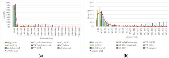 Following the application of post-processing to eliminate negative predictions in models V2, V3, and V5, a comparative analysis of spatial distribution was conducted. This included evaluating the average trip length and generating histograms of trip distances, focusing exclusively on inter-zonal trips. Among all models shown in Table 5, V4 demonstrated the best alignment with observed data in terms of average trip length. This model, trained without intra-zonal observations, effectively captured the spatial structure of commuting flows. Model V8 also yielded noteworthy results. Due to the use of dropout regularization, it exhibited the highest level of generalization and produced outputs most similar to those of the gravity model. In terms of total trip volume, most DNN models underestimated the aggregate number of inter-zonal trips. Conversely, models trained on limited datasets (specifically V1 and V6) tended to overestimate total trips. These discrepancies highlight the importance of training data scope and the inclusion of zero-trip observations. The gravity model (V0) showed the smallest deviation from the observed total, but this was largely due to the use of balancing procedures. These included adjustments to row and column sums and diagonal values to match predefined totals and shares. Without these corrective steps, the discrepancies would have reached several dozen percent, underscoring the limitations of proportional models in capturing complex spatial dynamics.