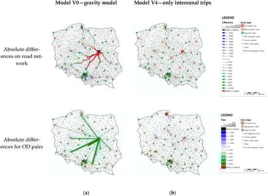 Absolute differences in traffic assignment results and for OD pairs for model V0 (a) and model V4 (b) compared to the base OD matrix.