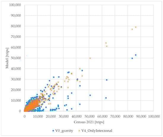 The comparative analysis clearly indicates that model V4 (Figure 10) achieved the best overall performance across all validation metrics. Notably, the R2 values for DNN models V2, V3, V4, and V5 consistently exceeded 90%, whereas the gravity model (V0) reached only 61%. Model V8, despite its generalization capabilities due to dropout regularization, produced results more comparable to the gravity model, both in terms of deviation and R2