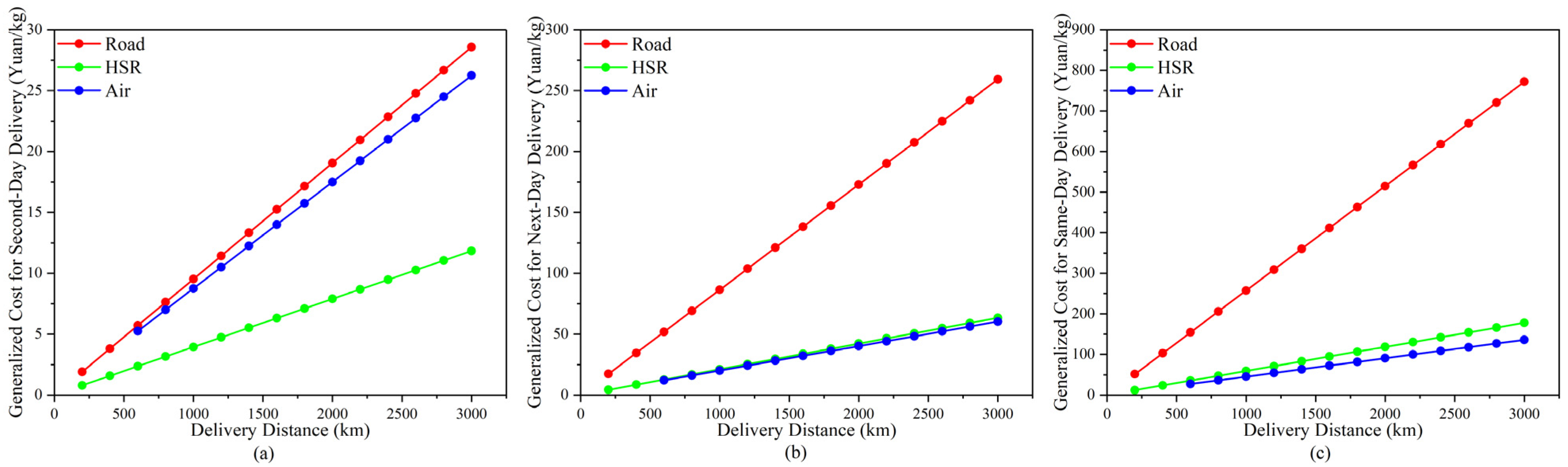 Finally, the generalized costs from the demand side for the three express modes under different timeliness sensitivity levels were calculated, as shown in