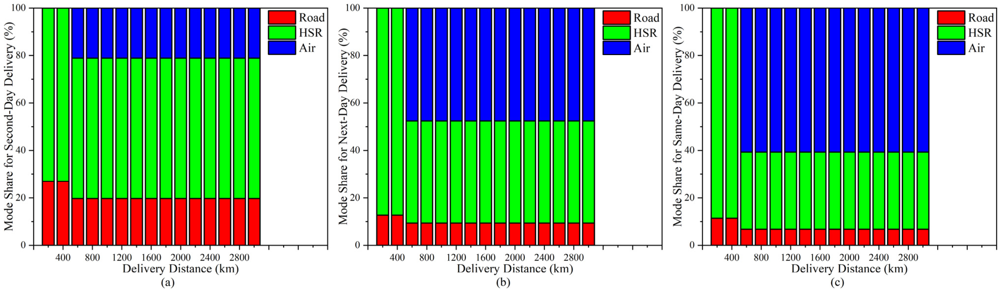 Figure 7. It can be observed that on the demand side, HSR express captures approximately 20% of the market share for distances exceeding 600 km. In second-day delivery scenarios, road express holds an absolute advantage. However, HSR express achieves a balance between transit time and cost at around 600 km, accounting for 18.4% of the market share. For distances beyond 1400 km, the mode share of HSR express gradually increases with distance, primarily due to its speed advantage over road transport for ultra-long-haul delivery. In next-day and same-day delivery scenarios on the demand side, HSR express compensates for the absence of air express services within 400 km, providing a more efficient and punctual solution for short-distance intercity delivery. For medium distances ranging from 400 km to 1000 km, HSR express stably occupies over 20% of the market share. Beyond 1000 km, HSR express does not exhibit disadvantages with increasing distance, maintaining a stable mode share of above 19%.