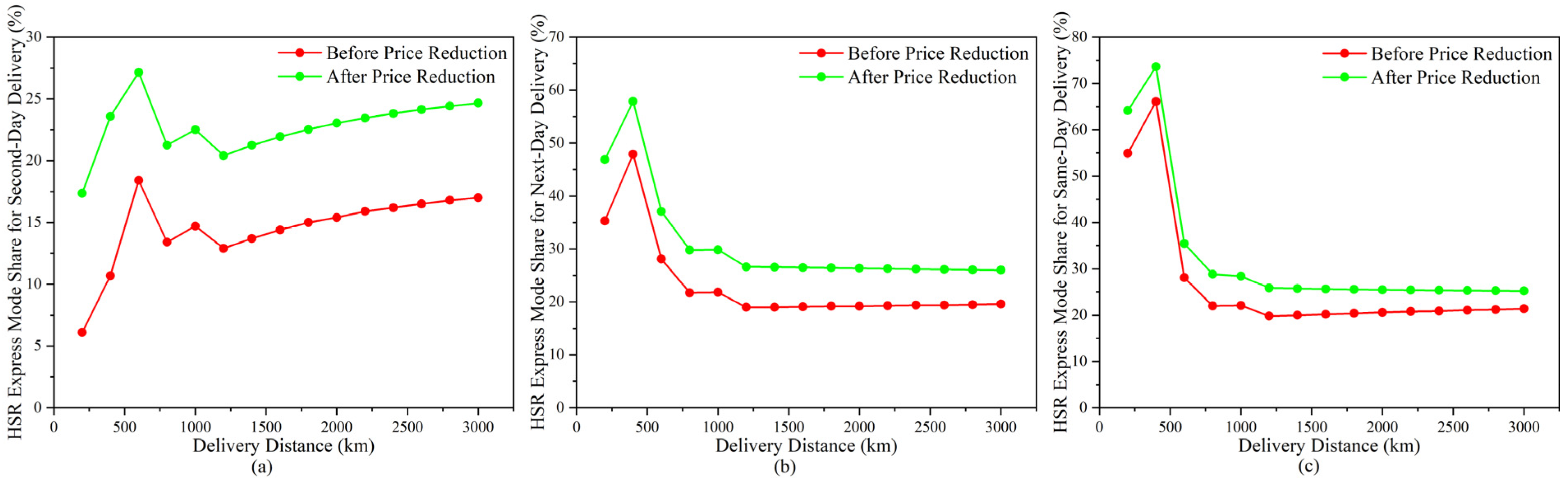 In the long term, with the development of HSR express services, it is possible to reduce the order placement price for HSR express by optimizing routes, improving efficiency, and reducing costs. When the price reduction reaches 40%, the mode share of HSR express increases to varying degrees under second-day, next-day, and same-day delivery scenarios, as shown in