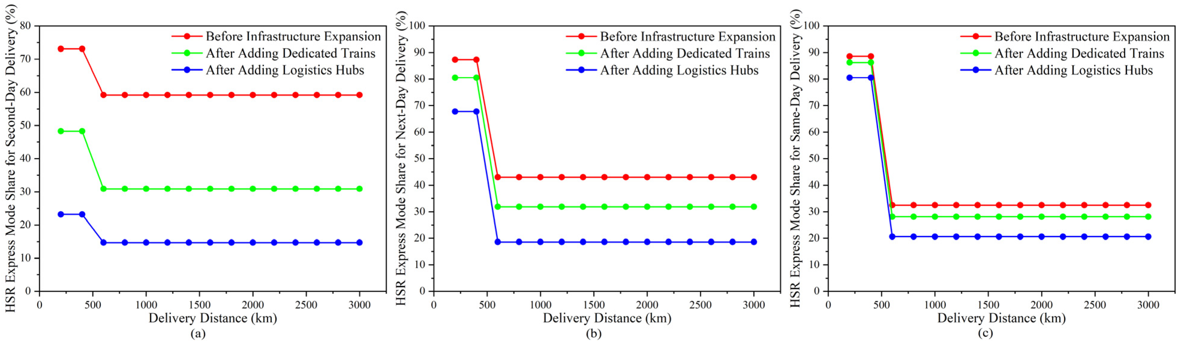 In the future, to facilitate larger-scale and more efficient HSR express services, more specialized and intensive equipment and infrastructure will be required to enhance loading capacity and handling efficiency. Two scenarios were considered: investing 300 million Yuan in purchasing dedicated HSR express trains and investing 3 billion Yuan in constructing HSR express logistics hubs. Under these scenarios, the mode share of HSR express decreased to varying degrees, as shown in