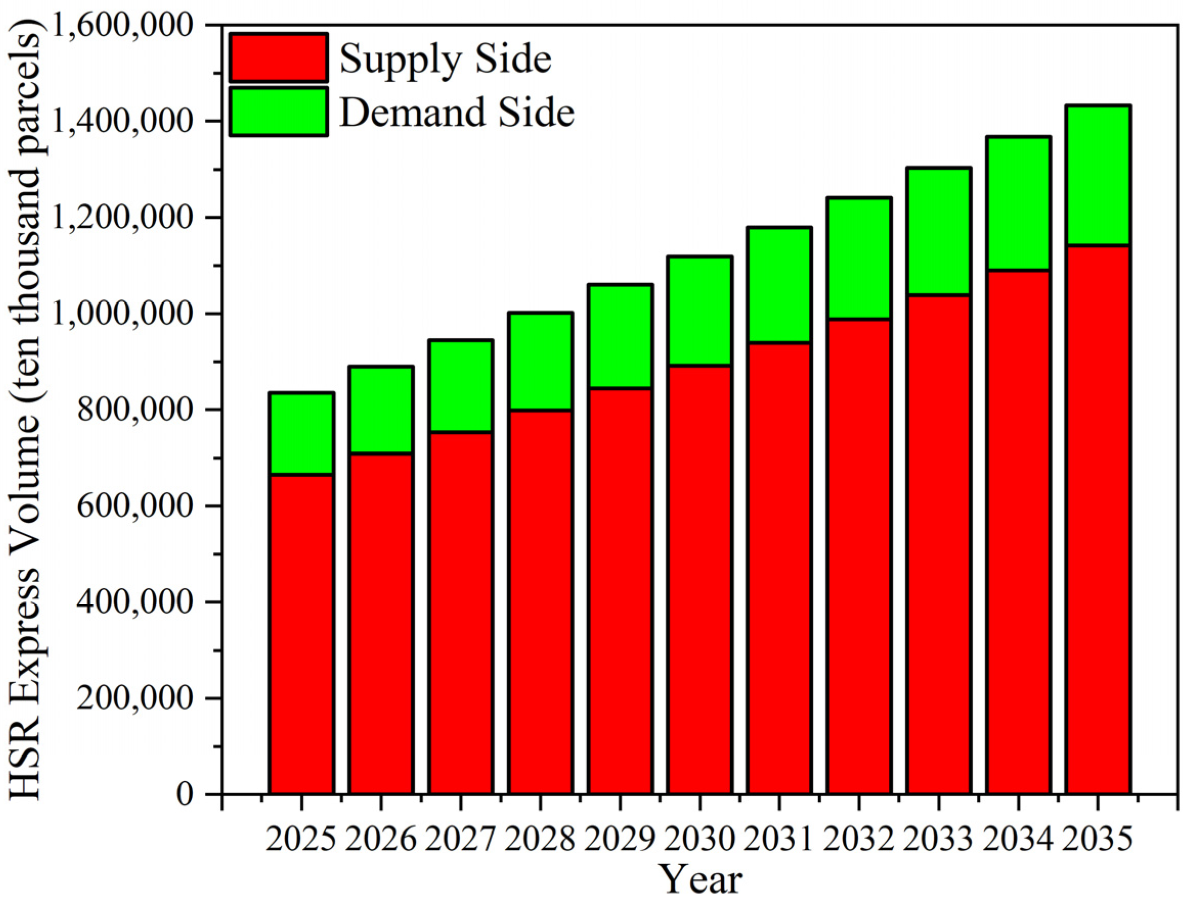 Among these, second-day delivery accounts for 85%, next-day delivery for 10%, and same-day delivery for 5%. Assuming that timeliness requirements and delivery distance are independently distributed, the projected HSR express volume from both the supply side and demand side for the years 2025 to 2035 can be derived based on the forecasted intercity express volume in China, as shown in