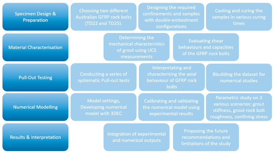 This study followed a structured experimental-numerical scheme to investigate the axial load transfer mechanism of fully grouted GFRP rock bolts. Two Australian-manufactured rock bolts, TD22 and TD25, were selected and prepared with double-embedment configurations under controlled curing times of 7, 14, 21, and 28 days. Material characterisation included uniaxial compressive strength (UCS) testing of the grout and shear testing of the bolts to determine their mechanical properties. These tests provided the fundamental parameters required for later calibration and analysis. Additionally, after designing, preparing, and casting the samples needed, they were subsequently cured in various time intervals. A series of systematic pull-out tests was then conducted to examine the axial behaviour of the fully grouted GFRP rock bolts with different ELs, bolt diameters, and curing times. The resulting load–displacement curves were used to derive key parameters and build a dataset, including peak load, displacement at peak, and axial stiffness. A three-dimensional numerical model was subsequently developed in 3DEC, utilising the pile/rock bolt structural element to simulate the pull-out tests along the fully grouted GFRP rock bolting systems. The model was calibrated against the experimental results and extended through parametric analyses on grout stiffness, grout-rock bolt roughness, and confining stress. This integrated approach allowed a comparison between the laboratory results and the numerical simulations, helping to explain how the mentioned parameters affect axial load transfer in fully grouted GFRP rock bolts. All these steps are shown in Figure 1.