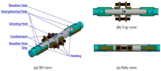 Once assembled, each solid bar was welded to its respective confinement section, and two steel plates measuring 20 × 100 mm were welded across the grips to reinforce the assembly and prevent separation under axial pull-out loading. The final sample assembly is shown in Figure 2, illustrating the complete configuration of the test specimen and confinement system.