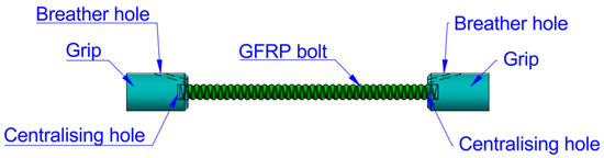 Schematic of the GFRP rock bolt system showing the GFRP rock bolt, grips, breather holes, and grouting holes.