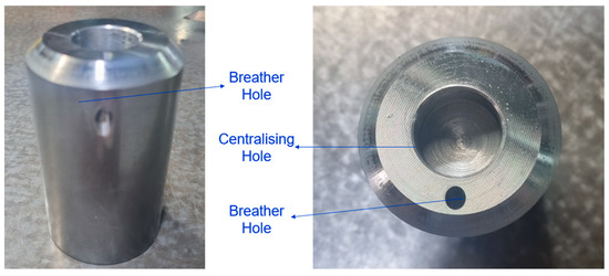 To ensure precise alignment of the rock bolt within the confinement, each steel grip was machined with a centralising hole, allowing the rock bolt to sit exactly along the centreline of the assembly. Additional alignment was achieved by drilling two opposing holes on each confinement section, positioned directly across from one another, which provided an apparent reference to confirm that the rock bolt remained correctly centred during preparation (Figure 3 and Figure 4).