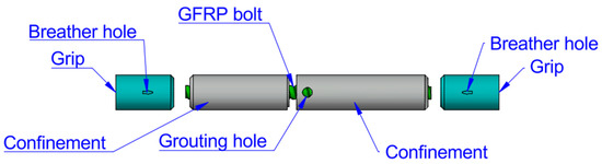 Each sample was secured between two custom-manufactured solid steel grips, allowing it to be clamped into the jaws of the MTS testing machine during pull-out testing. The grips were prepared from 55 mm diameter steel bars, with an overall length of 90 mm. To ensure proper alignment and centring of the GFRP rock bolts, each grip contained a centrally drilled recess measuring 15 mm in depth, with internal diameters of 22.4 mm and 25.4 mm, corresponding to the two bolt types used in the tests. One edge of each grip was chamfered to facilitate a reliable weld connection to the confinement sections.