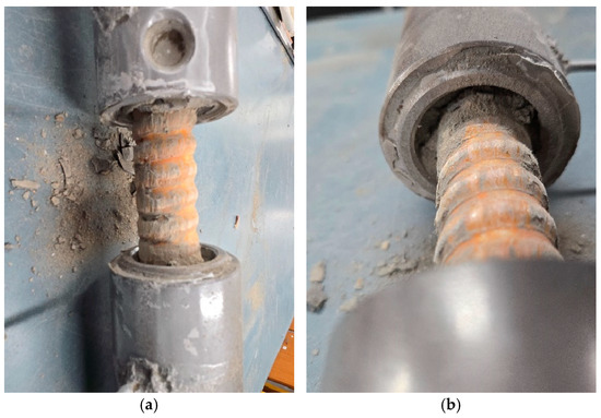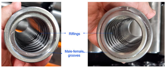 For grout injection, the system was designed with grouting holes and breather holes. During preparation, grout was pumped into the system through the grouting hole and exited through the breather holes, ensuring the grout filled the entire annulus and completely encapsulated the rock bolt along its whole length inside the confinement (Figure 5). To enhance the bond between the grout and the steel confinement, the internal surfaces were rifled, increasing surface roughness and promoting mechanical interlock (Figure 6).