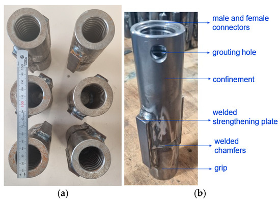 The confinement components were produced from additional solid steel bars, drilled to a diameter of 35 mm and internally rifled to simulate real field conditions and enhance the bonding interface between the grout and the confinement. The confinement sections were subsequently chamfered on one end to ensure a precise fit, while the opposite end featured a drilled recess to form a male-female connection with the corresponding grip.