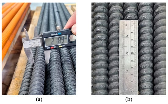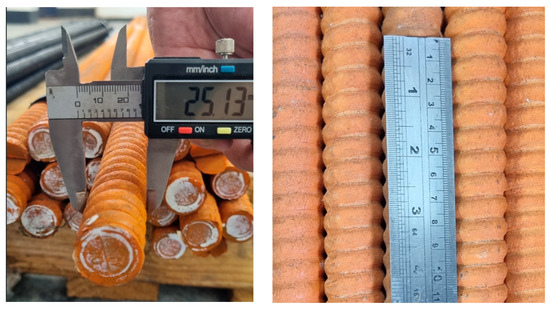 As mentioned earlier, two sizes of GFRP rock bolts, TD22 (22 mm diameter) and TD25 (25 mm diameter), were selected for the experiments. These products were sourced from Jennmar Australia. The specifications of the selected GFRP rock bolts are given in Table 2. The rock bolts were cut to specific lengths based on the embedment configurations and installed within the confinement system. The mechanical properties of the GFRP rock bolts are presented in Table 2, with their physical appearance shown in Figure 8 and Figure 9.
