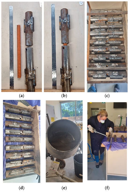 The assembled samples were grouped by ELs, positioned on the laboratory bench, and prepared for grouting. The bonding agent was mixed according to the manufacturer’s specifications, with a 35% water-to-grout ratio, and pumped into each sample through the designated grouting ports. Visual confirmation of grout exiting the breather holes ensured complete encapsulation of the rock bolts. The samples were then left to cure according to the testing schedule, with pull-out tests planned for 7, 14, 21, and 28 days of curing. The whole sample preparation process is illustrated in Figure 10.