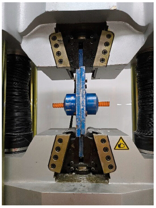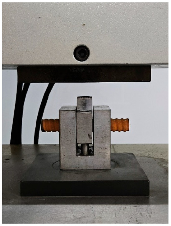 In a pure single shear test, the rock bolt element is subjected to shear loading along a single plane by applying force perpendicular to its longitudinal axis using a sharp-edged steel plate. The rock bolt element is fixed in place using a specially designed holder, and the load is increased until shear failure occurs. The shear strength is calculated by dividing the peak load by the cross-sectional area of the fracture surface [49]. Four GFRP rock bolts, each 200 mm in length, were tested using the single shear setup. The shear test setup for this configuration is shown in Figure 11.