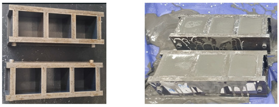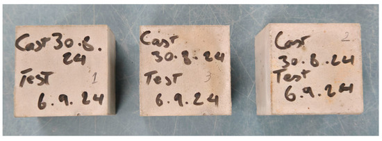 To evaluate the mechanical characteristics of the grout used in this study, uniaxial compressive strength (UCS) tests were conducted at various curing stages. Previous studies have highlighted the critical role of grout strength development over time, with factors such as curing duration, water-to-grout ratio, and material composition affecting UCS [51,52,53,54]. A total of 12 cubic grout specimens, each measuring 50 × 50 × 50 mm, were prepared from the same grout mixture used in the pull-out tests. The specimens were cast in steel moulds, demolded after 24 h, and cured under controlled laboratory conditions (Figure 13 and Figure 14).
