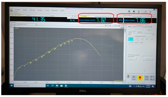 For the first sample, an extensometer was attached to measure the axial elongation of the rock bolts during testing (Figure 16). Special holders were designed to mount the extensometer securely on the sample. A comparison between the MTS machine data and extensometer readings (Figure 17) showed excellent agreement, validating the accuracy of the displacement measurements. For the remaining tests, data from the MTS machine were used exclusively.