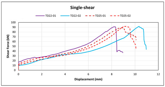 As mentioned before, to evaluate the shear behaviour of fibreglass rock bolts, both single-shear and double-shear tests were conducted on TD22 and TD25 rock bolt specimens. The load–displacement responses from the single-shear tests are presented in Figure 18. The TD22 rock bolts demonstrated higher peak loads and greater displacements at failure compared to the TD25 rock bolts, indicating superior shear strength and a more ductile failure mode. The load–displacement curves for TD22 rock bolts showed a gradual increase in load followed by a controlled decline after peak load, characteristic of ductile material behaviour. In contrast, TD25 rock bolts exhibited a steeper initial slope and a sharper load drop post-peak, suggesting more brittle behaviour.