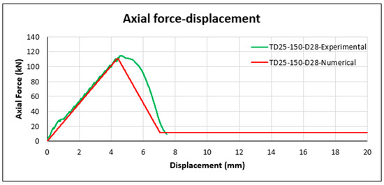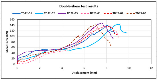 Similar trends were observed in the double-shear tests, as shown in Figure 19. TD22 rock bolts consistently exhibited higher peak loads and larger displacements at failure compared to TD25 rock bolts. The load–displacement curves further confirmed the greater ductility and energy absorption capacity of the TD22 rock bolts, while the TD25 rock bolts displayed more abrupt failure once peak load was reached.