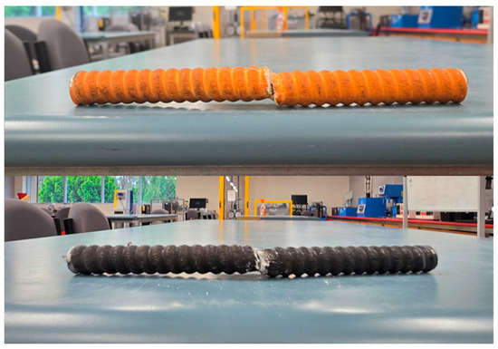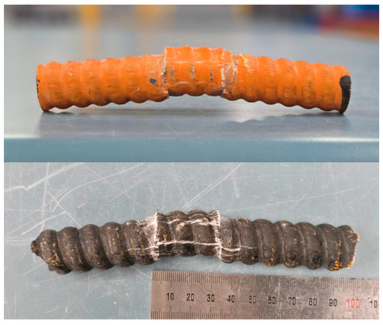 Visual inspection of the tested specimens after failure (Figure 20 and Figure 21) supported these observations, with TD22 rock bolts showing more progressive damage and TD25 rock bolts exhibiting sharper fractures.