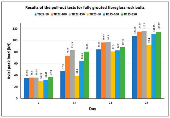 Pull-out testing is one of the most widely used techniques to assess the axial load transfer behaviour of rock bolts [17,55,56,57]. In this study, a comprehensive pull-out test program was conducted to evaluate the performance of fully grouted fibreglass (GFRP) rock bolts under varying embedment lengths, rock bolt diameters, and curing times.