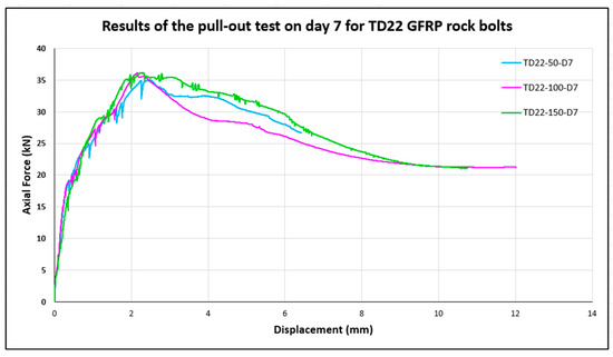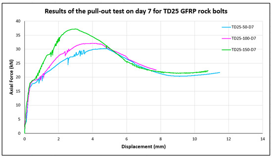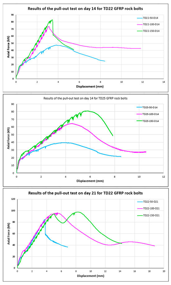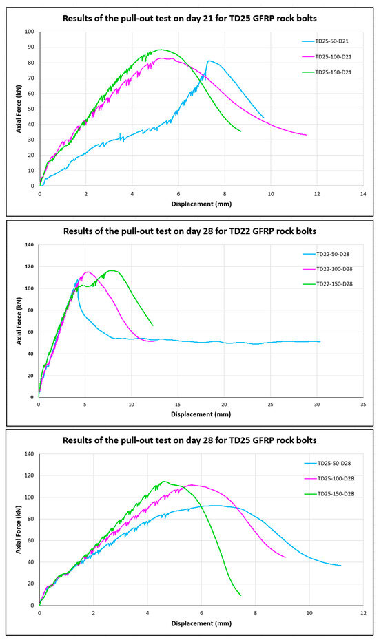 - Increasing the ELs from 50 mm to 150 mm resulted in a substantial rise in axial peak load for both GFRP rock bolt types, with TD22 increasing from 47.4 kN to 83.15 kN and TD25 from 39.4 kN to 80.85 kN at 14 days of curing—equivalent to gains of 75% and 105%, respectively. At 28 days, when grout strength was fully cured, the effect of EL remained evident, with TD25-150 and TD22-150 achieving peak loads of 114.59 kN and 116.2 kN, representing improvements of up to 25% over the shortest embedments. These results confirmed that both EL and curing time play decisive roles in enhancing bond mobilisation and overall axial performance of fully grouted GFRP rock bolts.