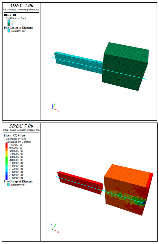 For this scenario, the lateral confining stress in the Y-direction (σYY) was kept constant at 1 MPa, while the confining stress in the Z-direction (σZZ) was progressively increased from 1 MPa to 5 MPa, as shown in Table 8. This loading condition represents realistic underground environments where in situ stresses acting perpendicular to reinforcement elements may not be uniformly distributed.