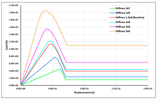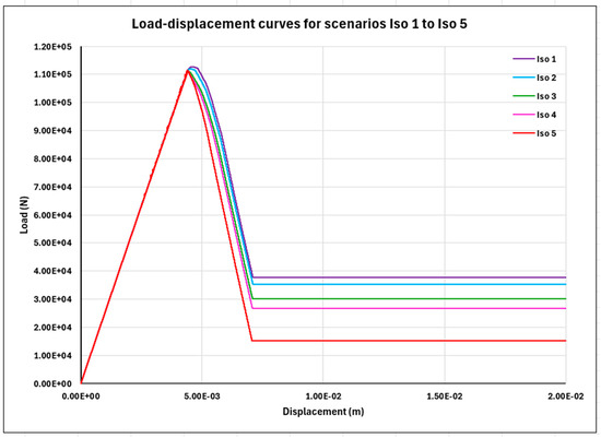 These results demonstrate that increasing confining stress in the Z-direction influences the failure load transfer mechanisms of the grouted reinforcement system (i.e., bond strength), promoting a more abrupt reduction in load-carrying capacity after the peak load is reached. Throughout these simulations, the properties of the grout, rock bolt, and interface materials remained constant, ensuring that the applied confining stress was the sole driver of the observed changes in system response.