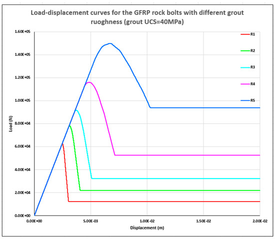 Load–displacement response of fully grouted fibreglass rock bolts under varying anisotropic confining stress in numerical simulations.