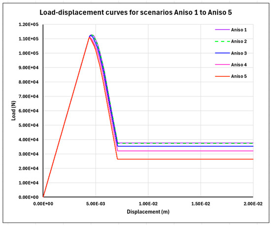 The results show that increasing σZZ, while holding σYY constant, produced noticeable changes in the post-peak behaviour of the system. The peak load remained relatively stable at approximately 110 kN across all anisotropic confinement levels, indicating that variations in σZZ alone do not affect the maximum load-carrying capacity of the system. However, the residual load retained after peak failure progressively decreased as σZZ increased. At the lowest confining condition (Aniso1, with σZZ = σYY = 1 MPa), the system retained a residual load of approximately 37.5 kN, reflecting moderate bond degradation but continued load transfer after peak mobilisation. As σZZ increased to 5 MPa in Aniso5, the residual load decreased to around 26 kN, and the slope of the post-peak load drop became steeper, reflecting a more brittle system response.