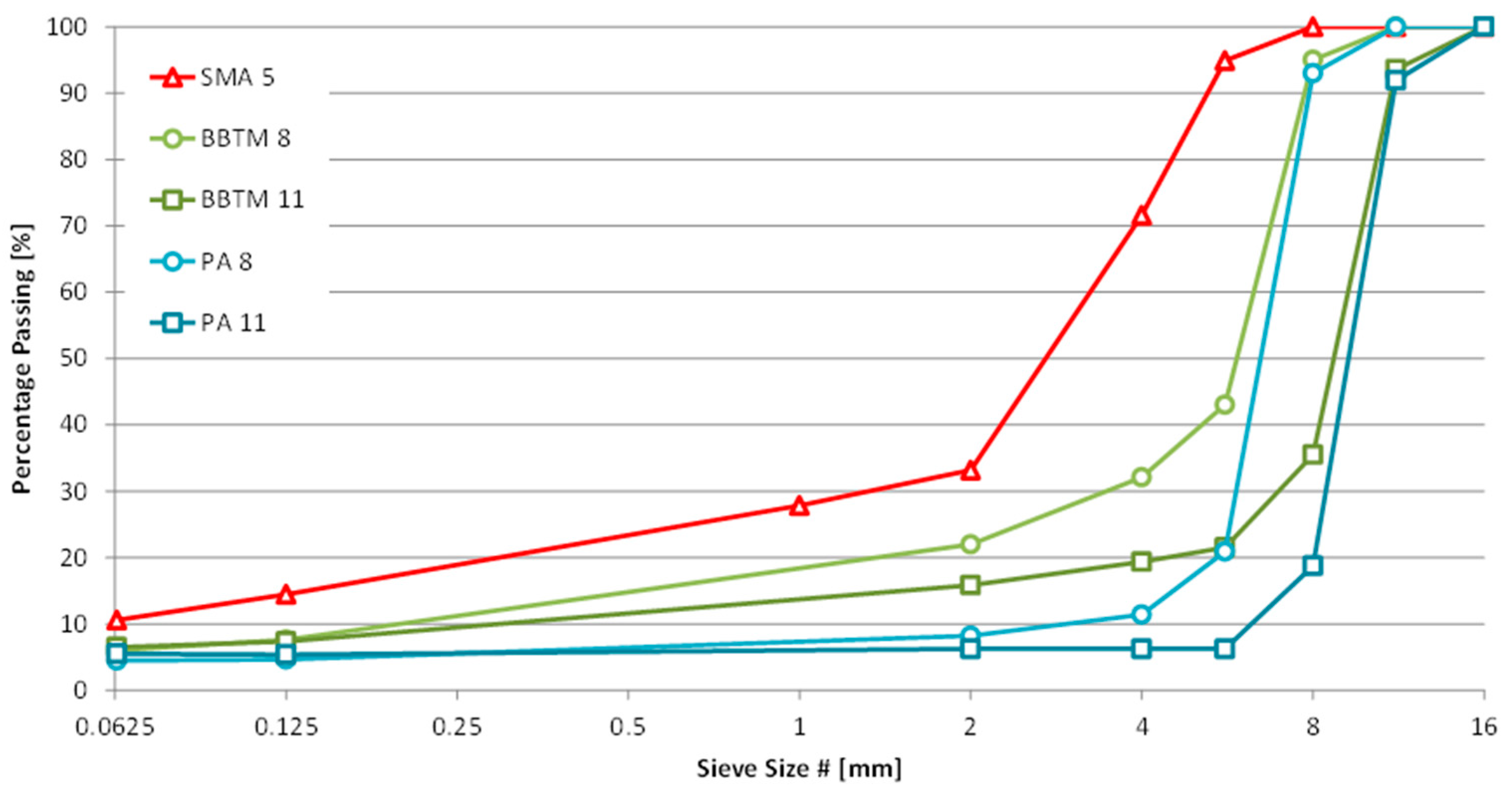 - Ranieri, V.; Sansalone, J.J.; Shuler, S. Relationships among Gradation Curve, Clogging Resistance, and Pore-Based Indices of Porous Asphalt Mixes. Road Mater. Pavement Des. 2010, 11 (Suppl. S1), 507–525. [Google Scholar] [CrossRef]