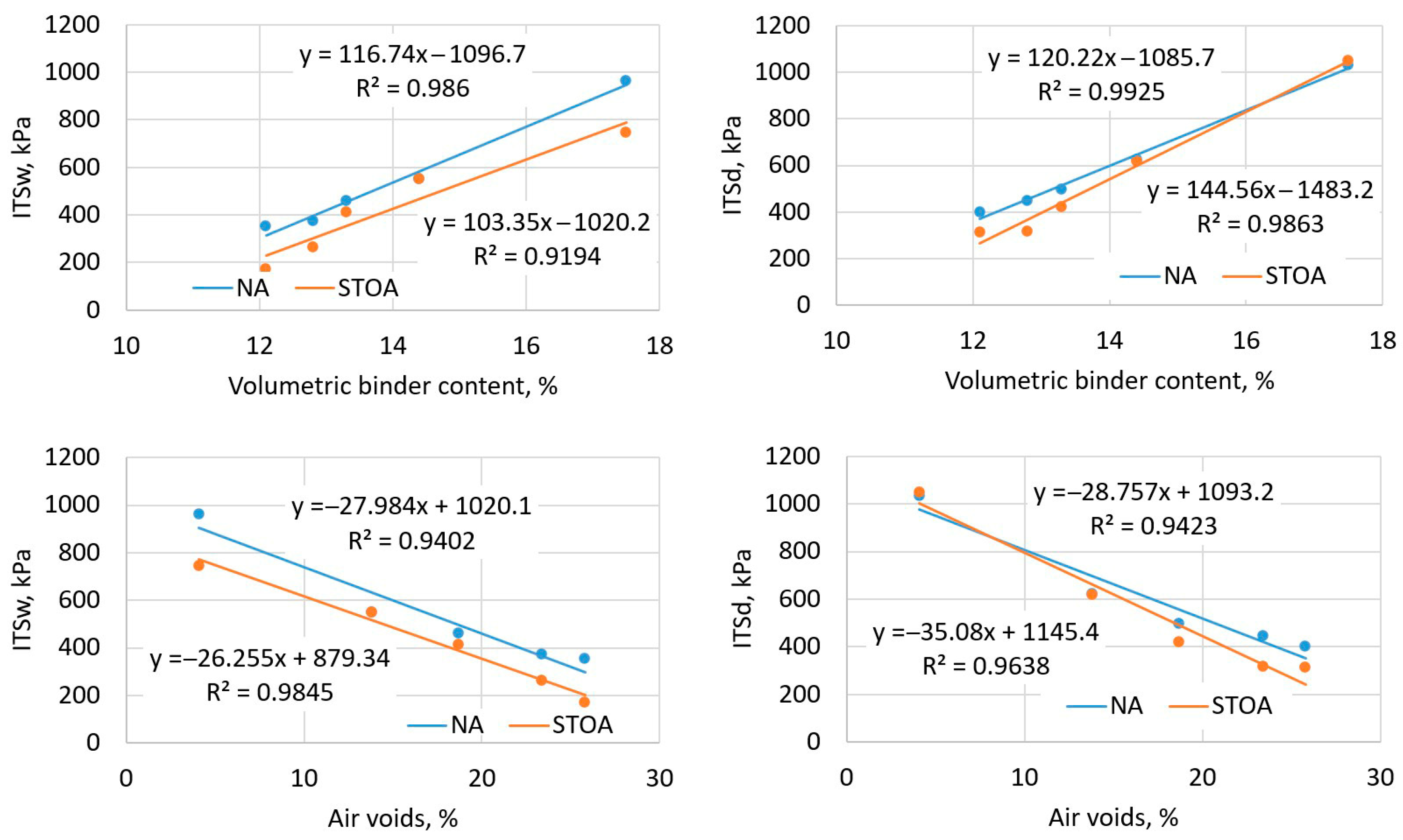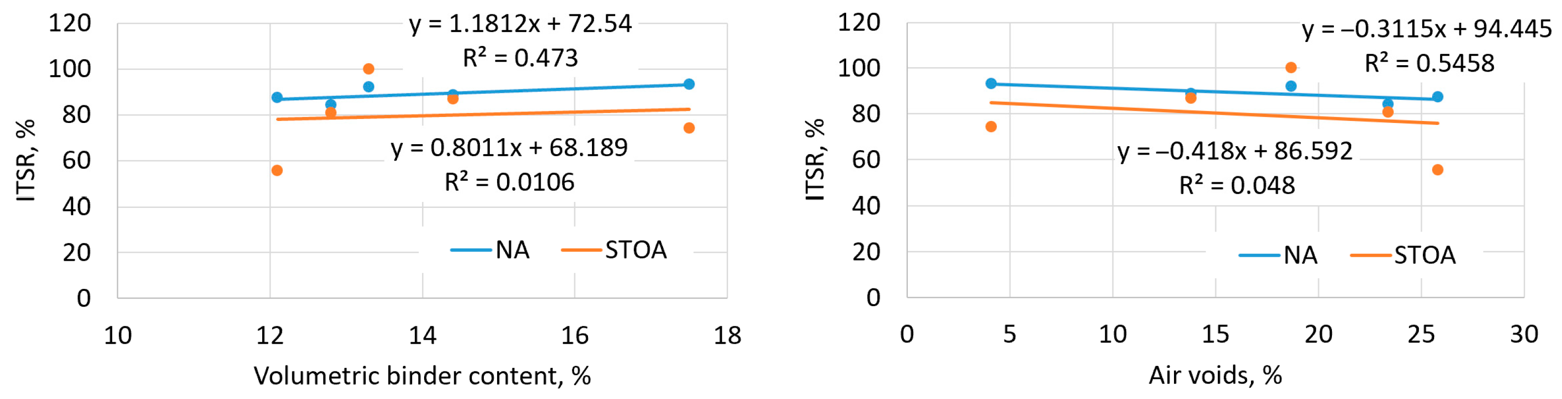 - In terms of water and frost resistance, the SMA 5 mixture demonstrated slightly better parameters than the other mixtures, but the significantly higher tensile strength values were particularly observed, regardless of the ageing and conditioning of the samples. For mixtures with higher void content and lower asphalt content, meeting the ITSR requirement of at least 90% proved difficult. STOA technological ageing adversely affects water and frost resistance.
