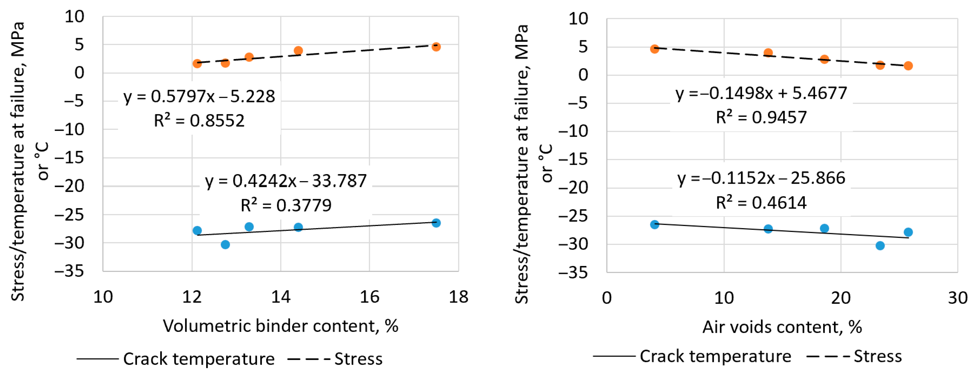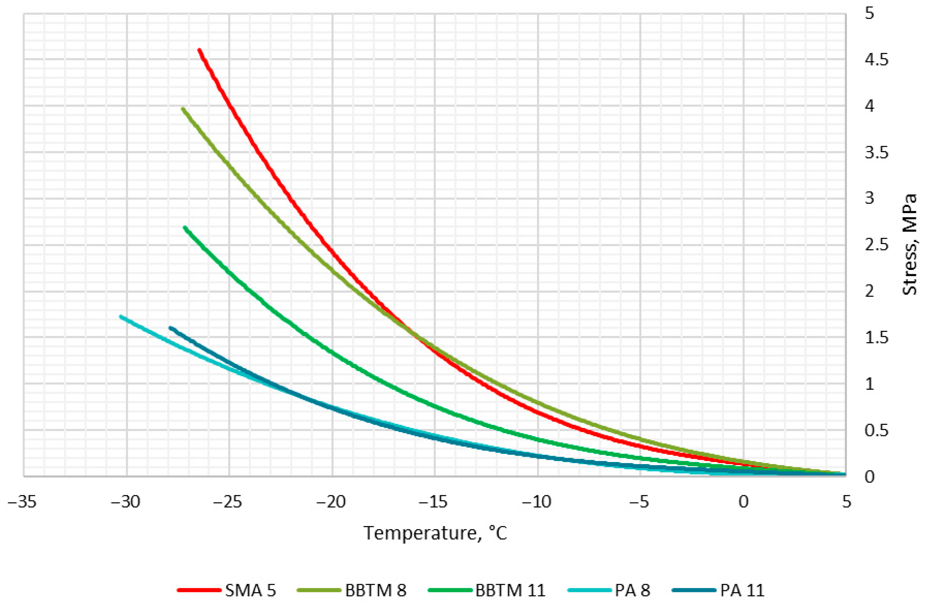 - The results of the low-temperature crack resistance test under limited deformation conditions yielded slightly different conclusions. In this case, the best results in terms of fracture temperature were achieved by the PA 8 and PA 11 Porous Asphalt mixtures, while the lowest results were achieved by the SMA 5 mixture. At the same time, the mixtures with the highest void content were characterised by significantly lower tensile stress at fracture and significantly lower stress increase. Despite the relatively positive assessment of PA mixtures based on TSRST test results, it should be noted that the method itself does not account for more unfavourable conditions that may occur during operation, such as freezing of a water-saturated porous layer, which can occur especially in the case of dirt or impeded drainage from the pavement.