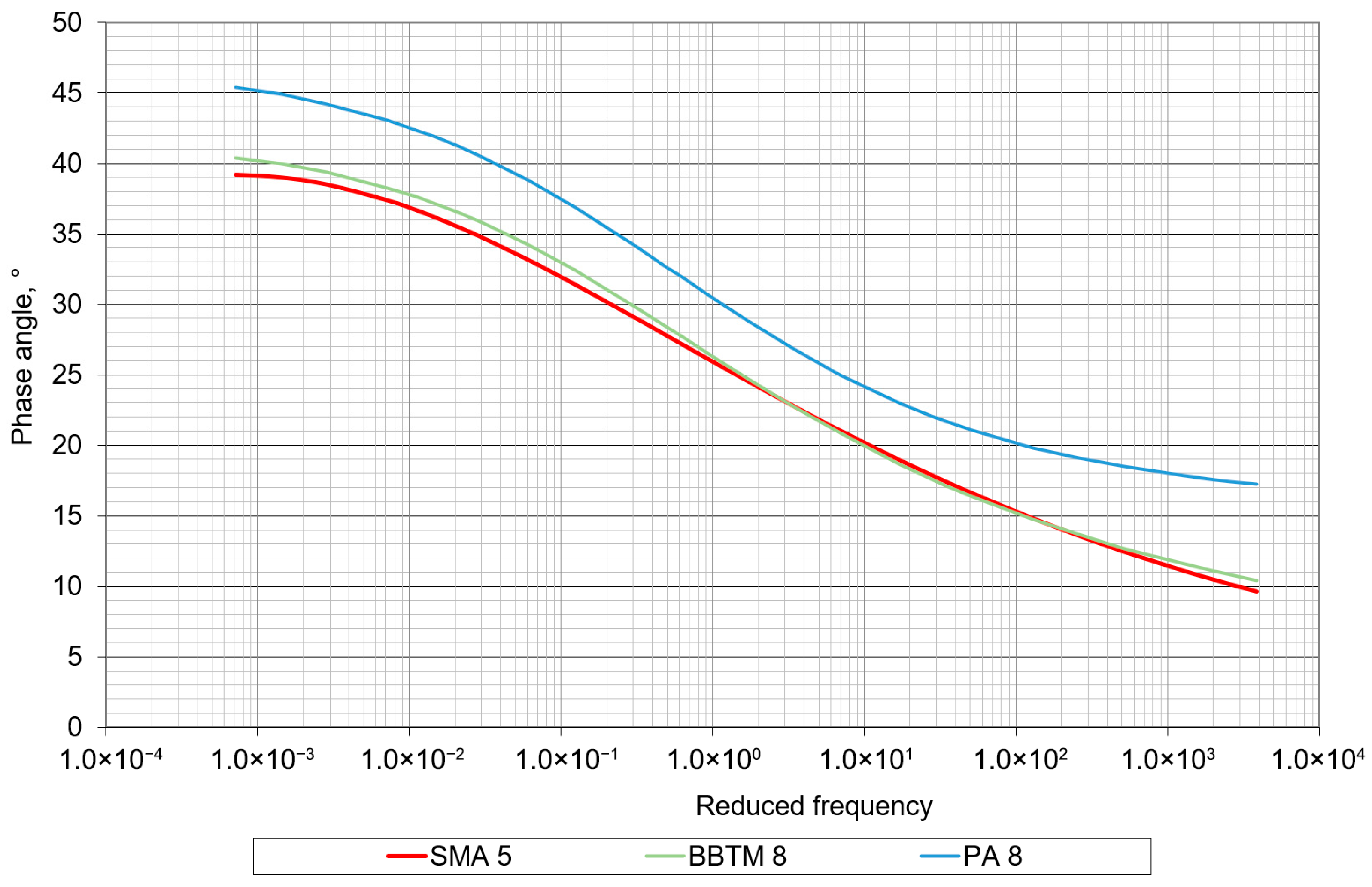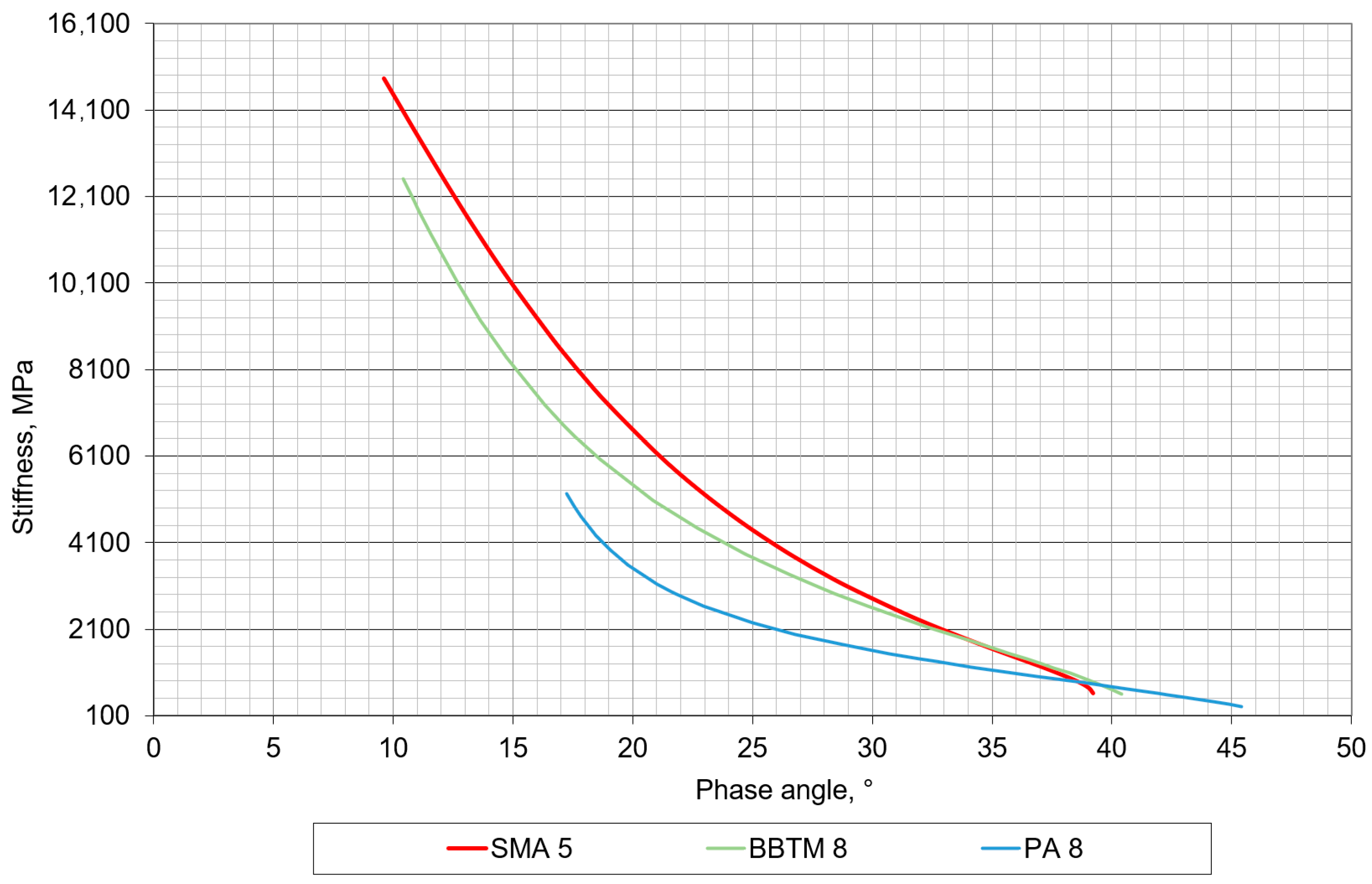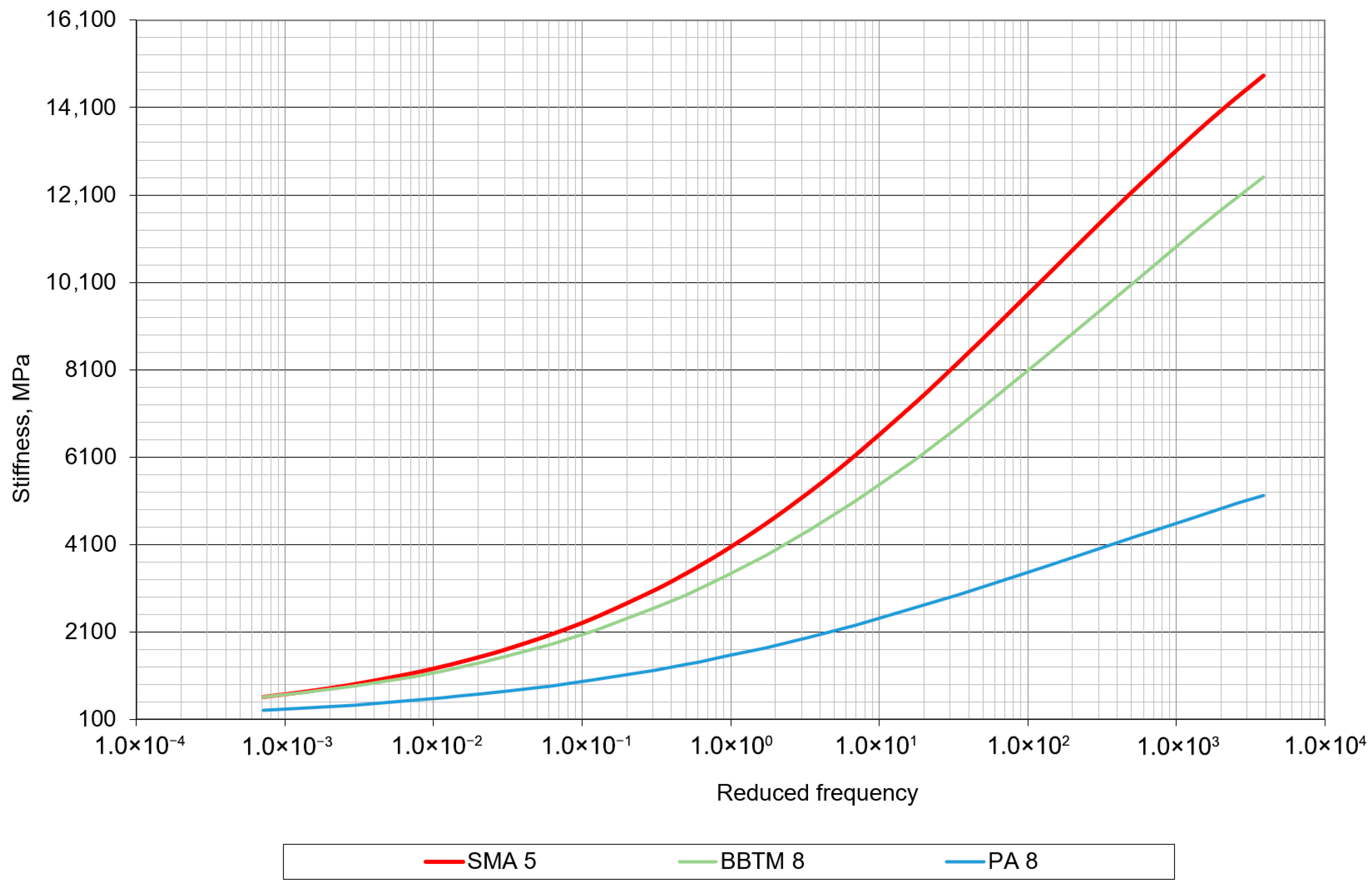 - The third analysed characteristic was fatigue resistance. This phenomenon is primarily attributed to the lower structural layers, but the mechanism of fatigue crack initiation in the wearing course on roads with very heavy traffic is also known. In this case, the SMA 5 mixture is characterised by significantly higher fatigue life than the BBTM 8 and PA 8 mixtures. This is due to the beneficial effect of increased binder content and lower void content.