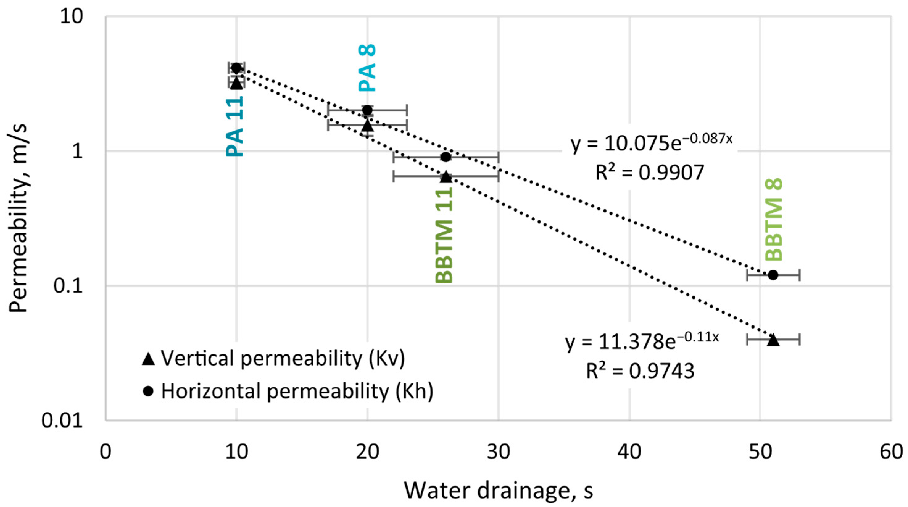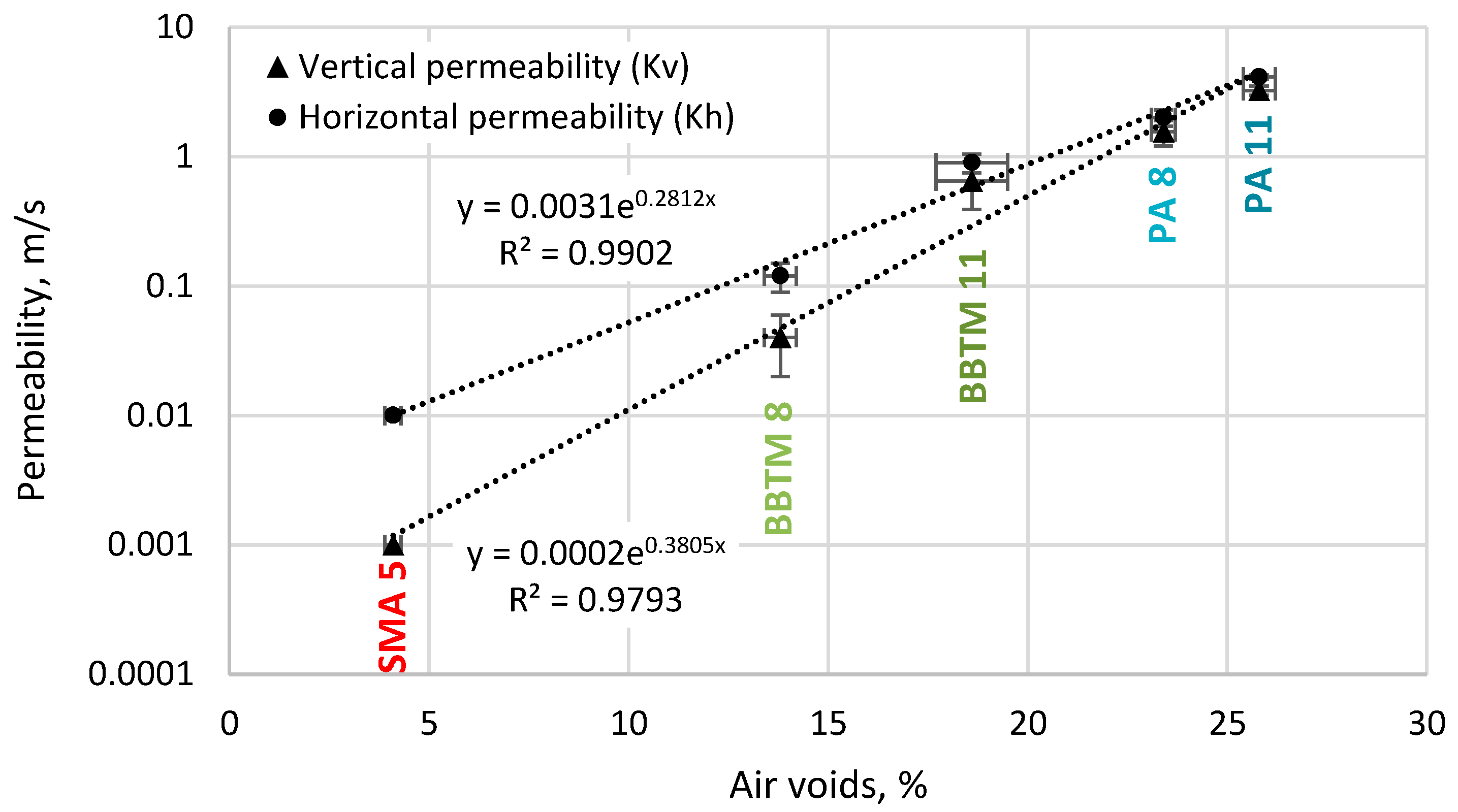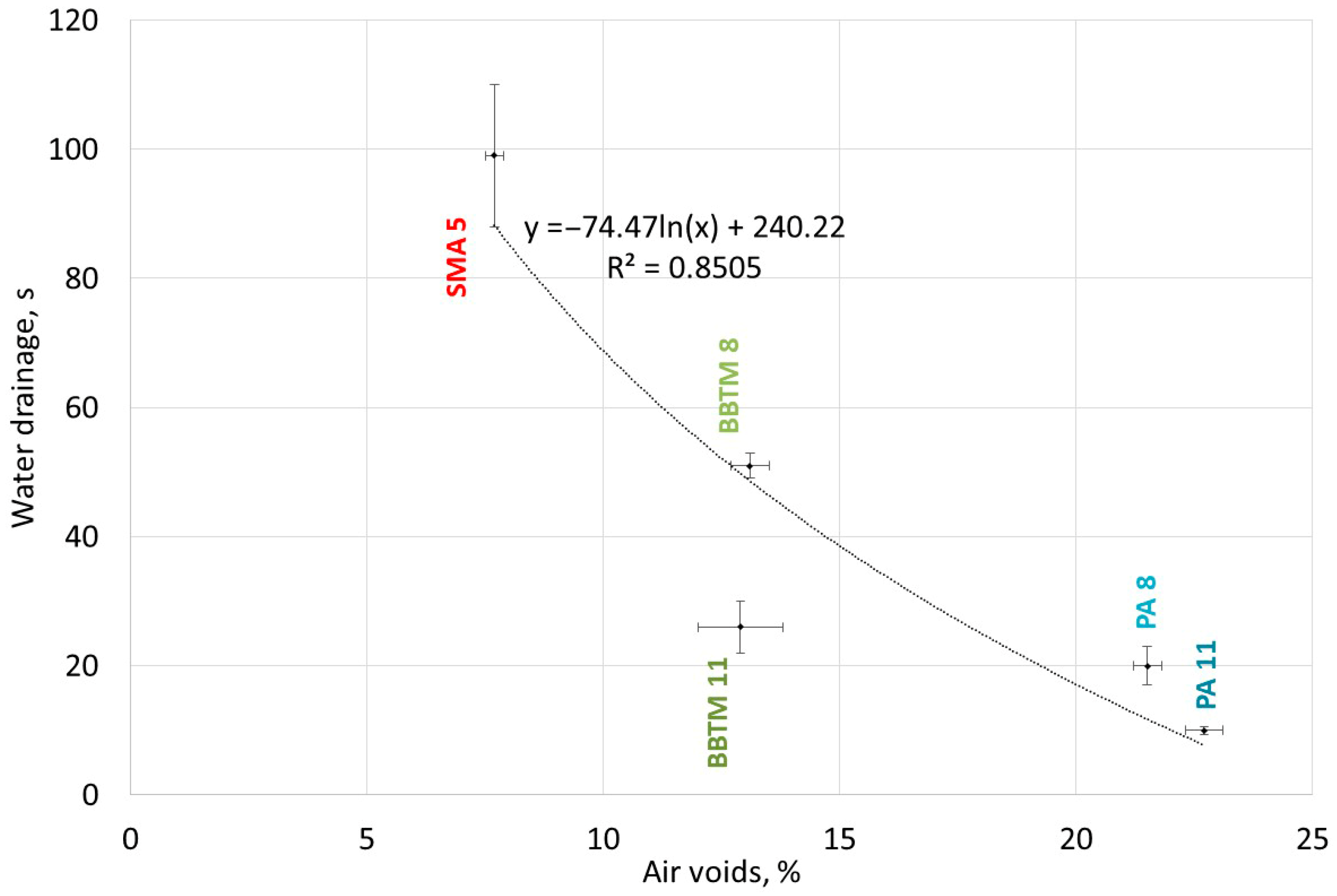 - According to the laboratory and in situ water permeability tests, it should be noticed that in the laboratory mixtures with finer aggregate gradation, such as BBTM 8 and PA 8, exhibit lower horizontal permeability than their corresponding mixtures with coarser gradation, namely, BBTM 11 and PA 11. In the field, the PA 11 mixture demonstrates the most favourable drainage performance. Moreover, as the air void content increases, water drainage improves.