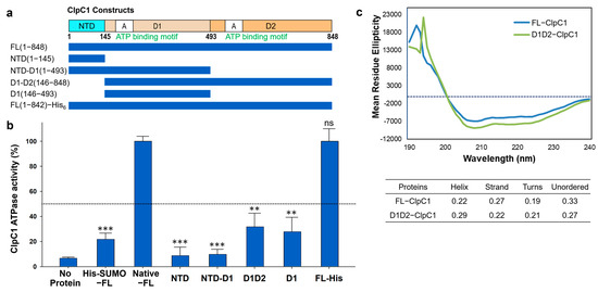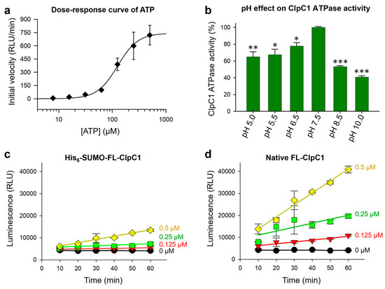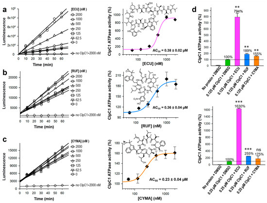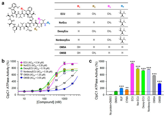 Mtb) remains a major global health challenge, prompting the need for new therapeutics targeting essential bacterial proteins. The caseinolytic protein C1 (ClpC1) is a promising drug target, and accurate measurement of its ATPase activity is critical for understanding drug mechanisms. We optimized a sensitive luminescence-based ATPase assay and evaluated ClpC1 constructs with various tag positions and truncations. N-terminal tagging significantly impaired enzymatic activity, whereas C-terminal tagging had no effect; truncated domains showed reduced activity compared to native full-length (FL) ClpC1. Using the native FL-ClpC1, we assessed ecumicin (ECU) and five analogs via ATPase activity and surface plasmon resonance (SPR), using rufomycin (RUF) and cyclomarin A (CYMA) as controls. RUF and CYMA bound tightly (