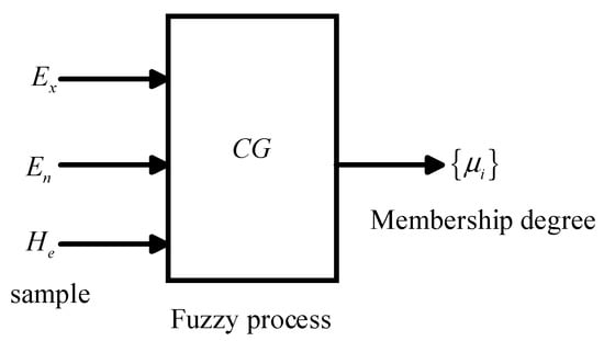 Given a quantitative sample with a specific value in the quantitative domain, the process of generating the certainty degree that this value belongs to a qualitative concept is called the antecedent cloud generator. This method can be used to determine the membership degree of test data to a certain qualitative description. The diagram of the antecedent cloud generator is shown in Figure 6.
