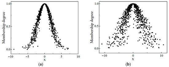Through the above process, N cloud drops can be generated, and a typical cloud cluster is illustrated in Figure 3. Analyzing the visual appearance of the two cloud diagrams a and b in Figure 3, the eigenvalues are the same, different , or different . Among them, the cloud droplets in Figure 3b take a wider range of values, and the deterministic distribution of Figure 3b is “thicker” than that of Figure 3a.