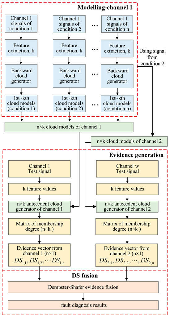 In the modeling stage, modeling signals from channel 1 and channel 2 are firstly utilized for feature extraction. Then, the extracted features are employed to construct cloud models, which serve as reference standards for the subsequent membership degree calculation of testing samples. In the evidence generation stage, features are extracted using testing samples obtained from both accelerometers. Then, the extracted features are input into the previously established cloud models to calculate their membership degrees with respect to various features under different modes, thereby generating evidential information from the two sensors. Finally, the evidence from multiple sensors is fused using the Dempster–Shafer evidence theory; thus, the final fault diagnosis results can be obtained.