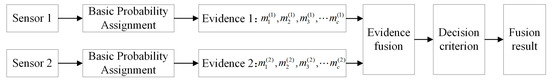 D-S evidence theory is an inference method based on belief functions that enables decision support under incomplete information. It is particularly suitable for multi-source information fusion and uncertainty modeling scenarios. The channels, respectively, output membership degree vectors corresponding to each fault category. These results serve as sources of evidence and are input into the D-S fusion framework. The principle of two channels fusion is illustrated in Figure 7.