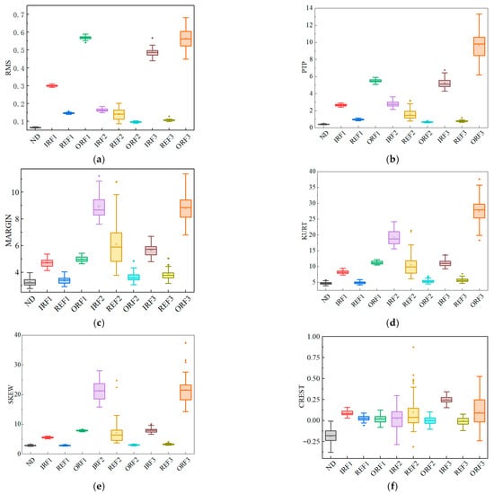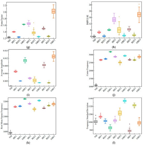 In fields such as fault diagnosis, accurately extracting and analyzing features is crucial for identifying system states and diagnosing faults. In the preliminary work, we extracted 12 key features from the signals. To more intuitively display the data distribution of these features under different operating conditions or states, and to analyze their dispersion, their central tendency, and the presence of outliers, we used boxplots as an effective visualization tool. The specific boxplots are shown in Figure 8.