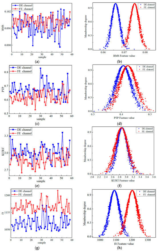 For the FE channel, after the same modeling process, the confidence matrix of test samples can be constructed and its corresponding membership degree vector can be obtained after average operation. Table 5 presents the membership degree vectors of these FE channel test samples in various fault category models, where the samples correspond to the DE channel samples listed in Table 3 (sampled at the same time).