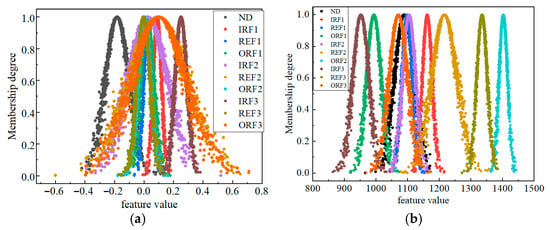 For each fault category, several initial segments are selected as modeling samples to calculate the cloud model parameters of the features, obtaining the , , and for each feature dimension. For a specific feature sequence , its cloud model parameters , , and can be obtained using the backward cloud generator introduced before to describe the uncertain probabilistic distribution of the related fault type in its feature space. So that, seen as Figure 5, as to each fault type and each channel, a set of cloud models can be obtained, the number of which equals to the number of extracted feature types.